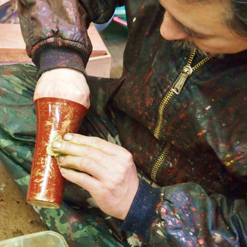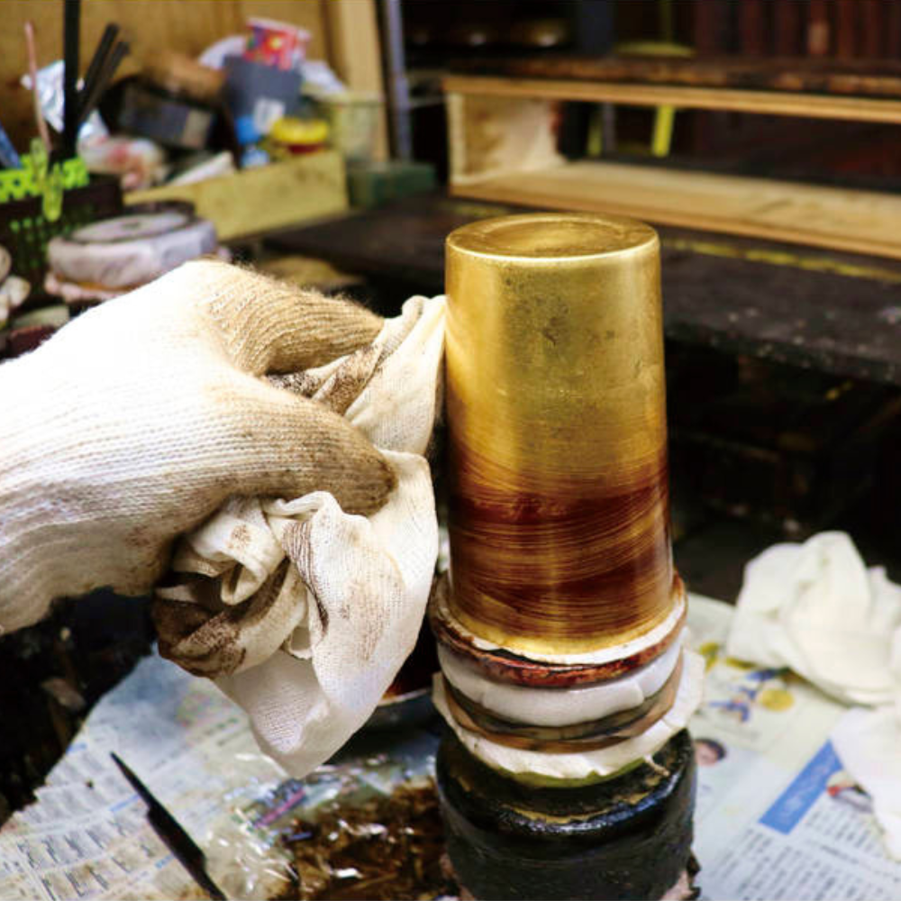 ・高端双层不锈钢杯,外层装饰金泽金箔,并施以传统手工拭漆工艺。
